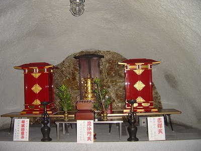 まとった大師像が祀られている。また、近くには鐘楼や毘沙門天を安置している岩